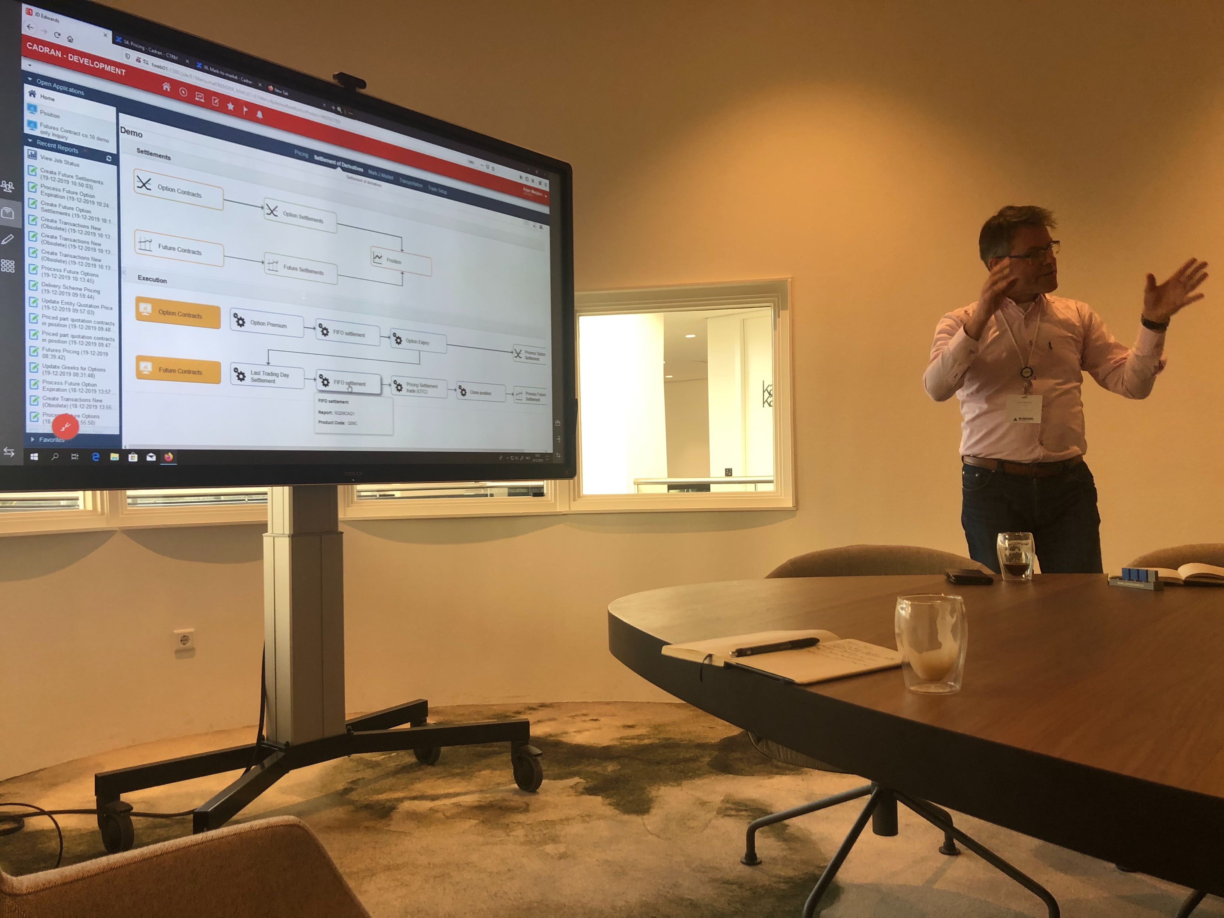 Together with Cadran Consultancy B.V. Novitam demonstrated the latest functionality developed in CTRM4JDE to support derivatives trading. The software included pricing of physical and future contracts based on complex pricing rules; financial settlement of derivatives and expiry of options and calculation of M2M (unrealized P&L) and Greeks on options.